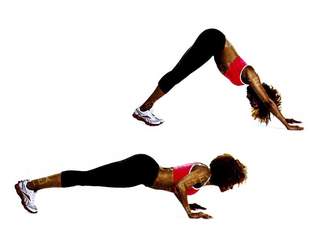 • Примите позу планки (на носках или на коленях), руки перпендикулярны полу.