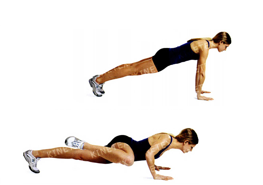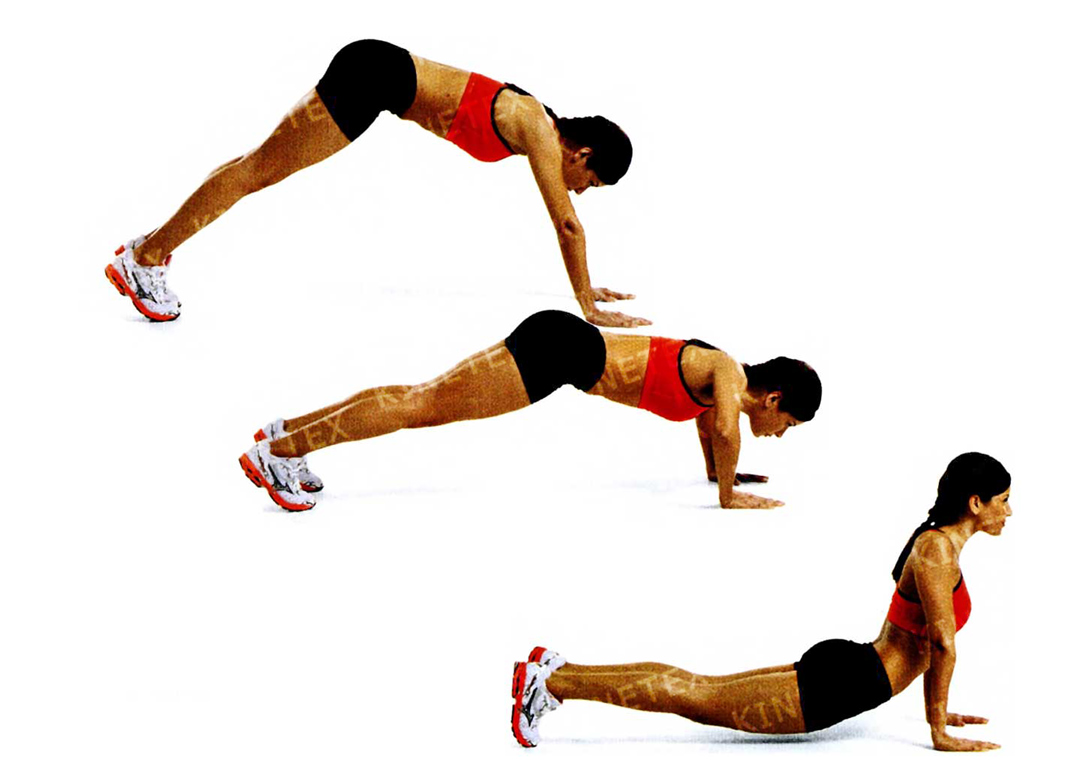 • Согнув руки в локтях под прямым углом, опустите грудь к полу. Отожмитесь, выпрямляя руки. Это одно повторение.