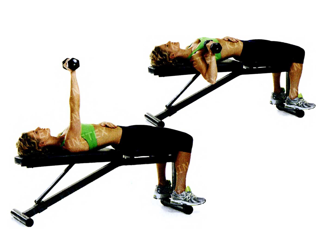 • Опустите гантели к груди, зафиксировав положение туловища за счет брюшного пресса.