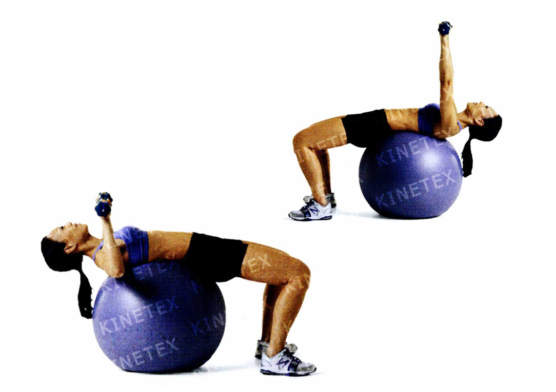 • Возьмите гантели и лягте спиной на гимнастический мяч. Приподнимите таз так, чтобы тело образовало одну прямую линию от плеч до коленей.