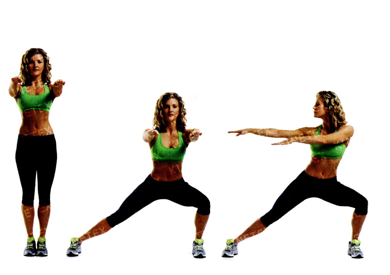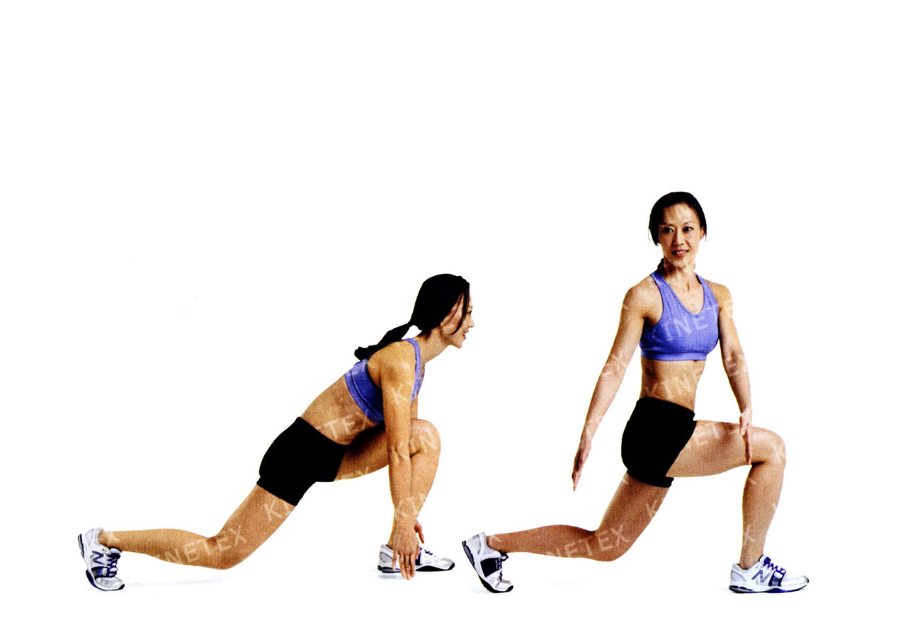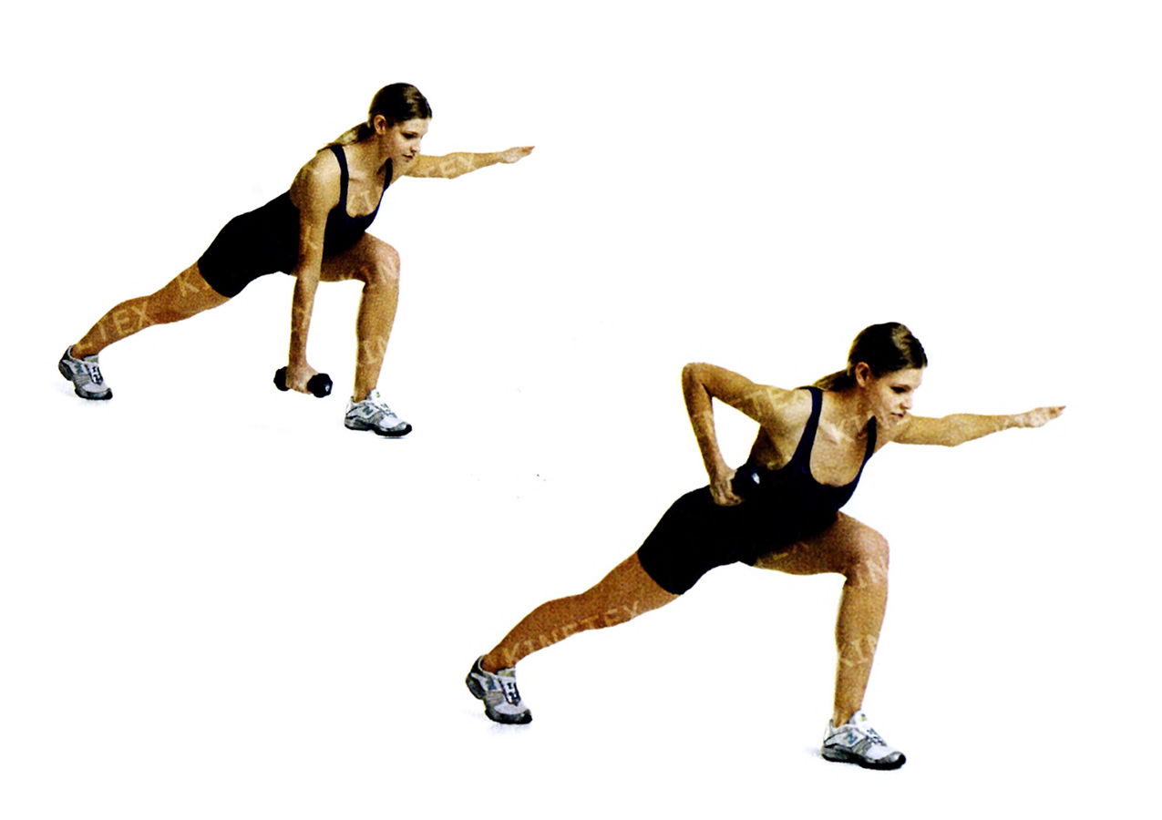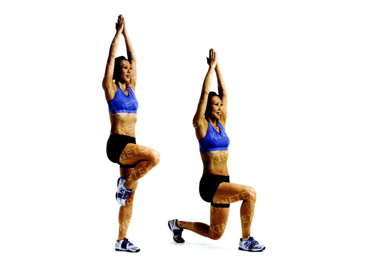 • Сделайте большой шаг вперед правой ногой и опустите таз так, чтобы бедро было параллельно полу.