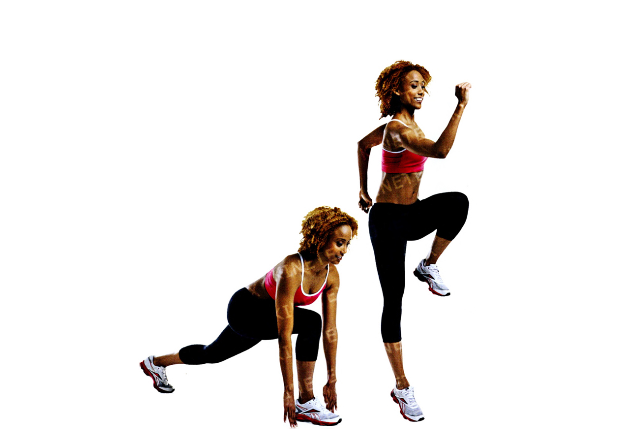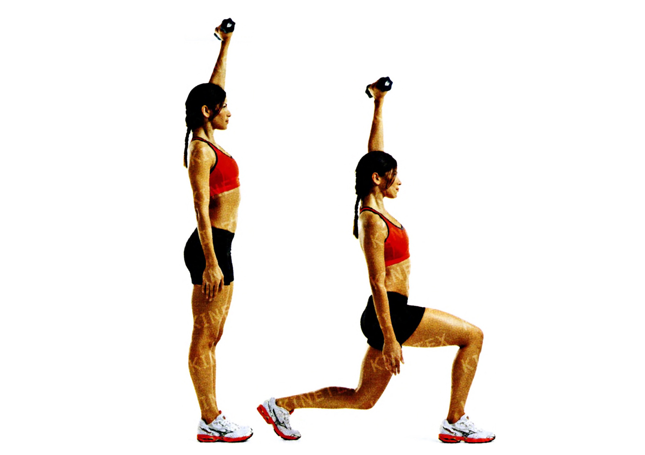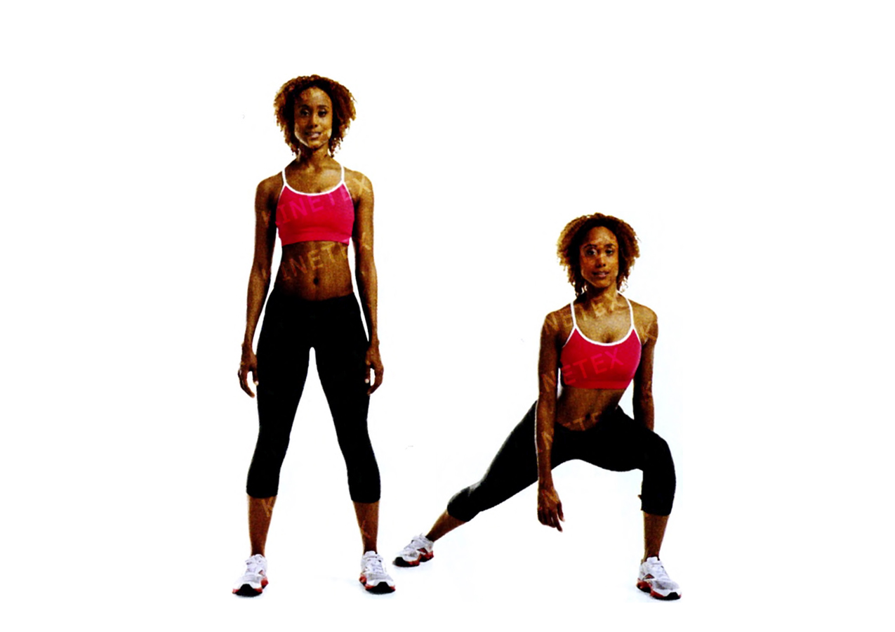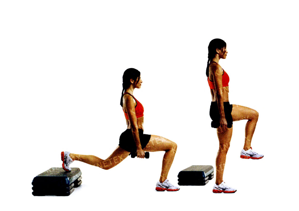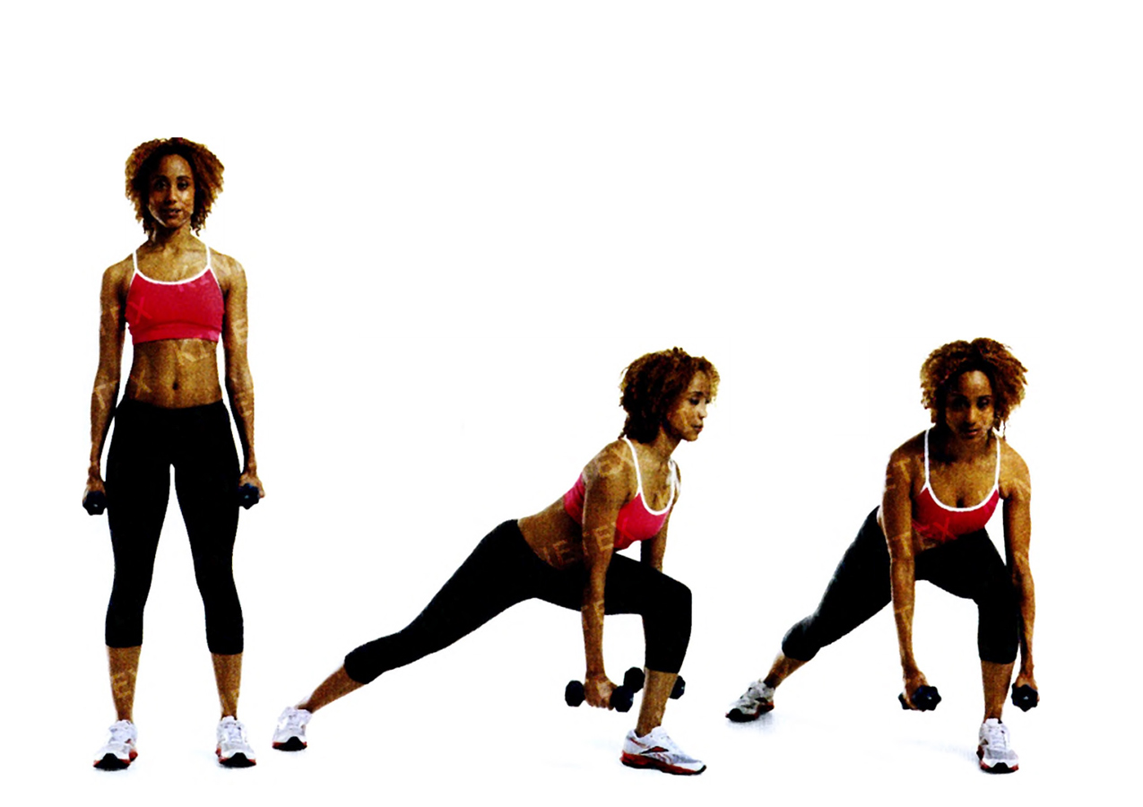 • Сделайте большой шаг вперед правой ногой и опустите таз так, чтобы бедро было параллельно полу.