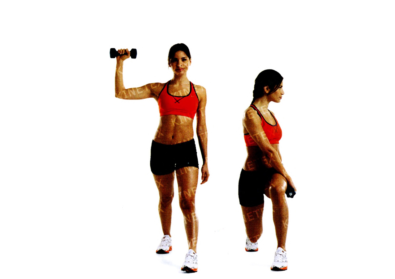 • Поднимите левую руку с гантелью над головой, держа локоть близко к уху.