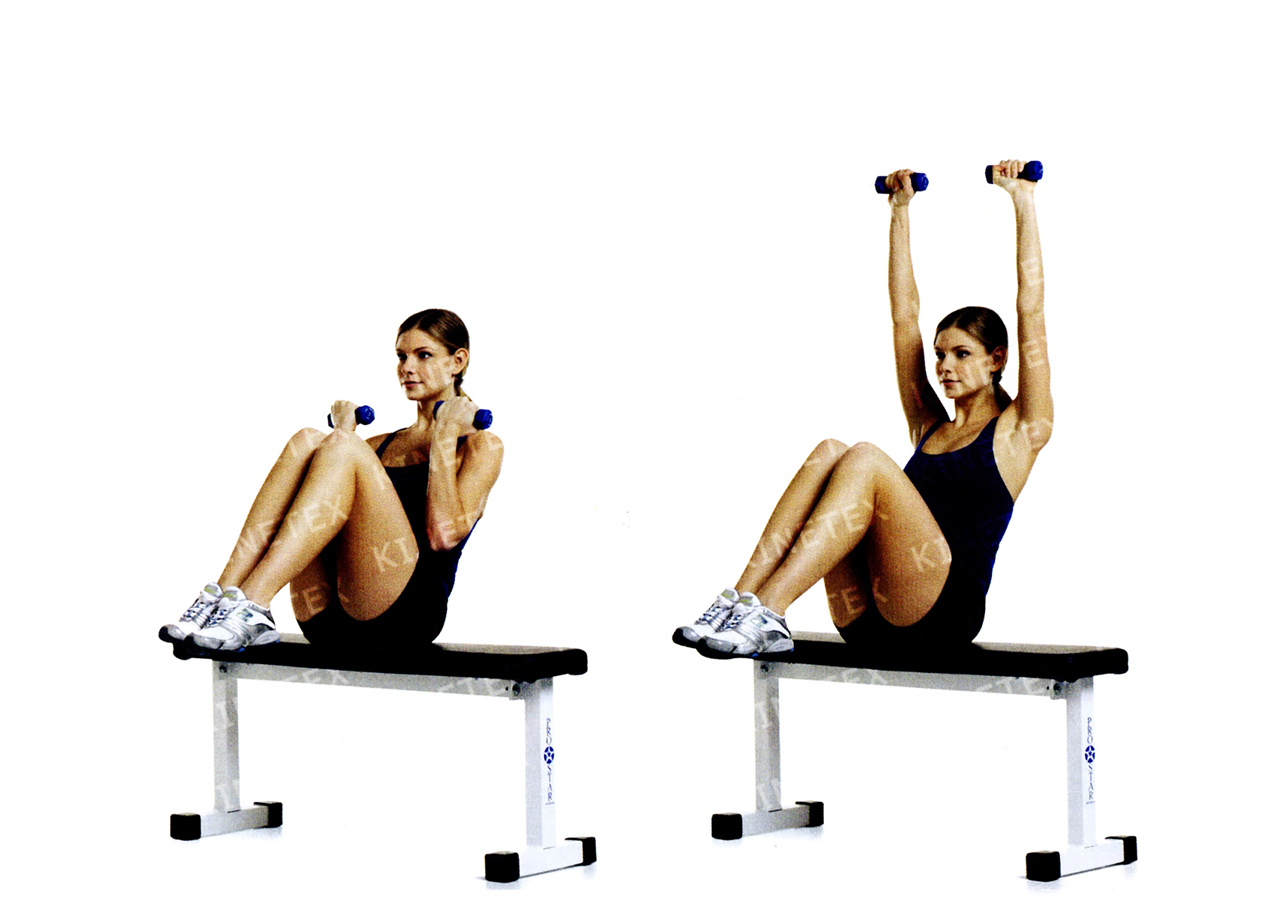 • Сядьте на скамью, немного отклонитесь назад, подтяните колени к груди и балансируйте на копчике. Держите гантели в опущенных по бокам руках.