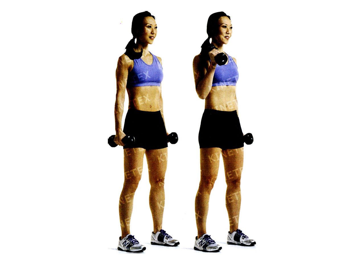 • Сгибайте правую руку, подтягивая гантель к плечу, и не поворачивая кисть.