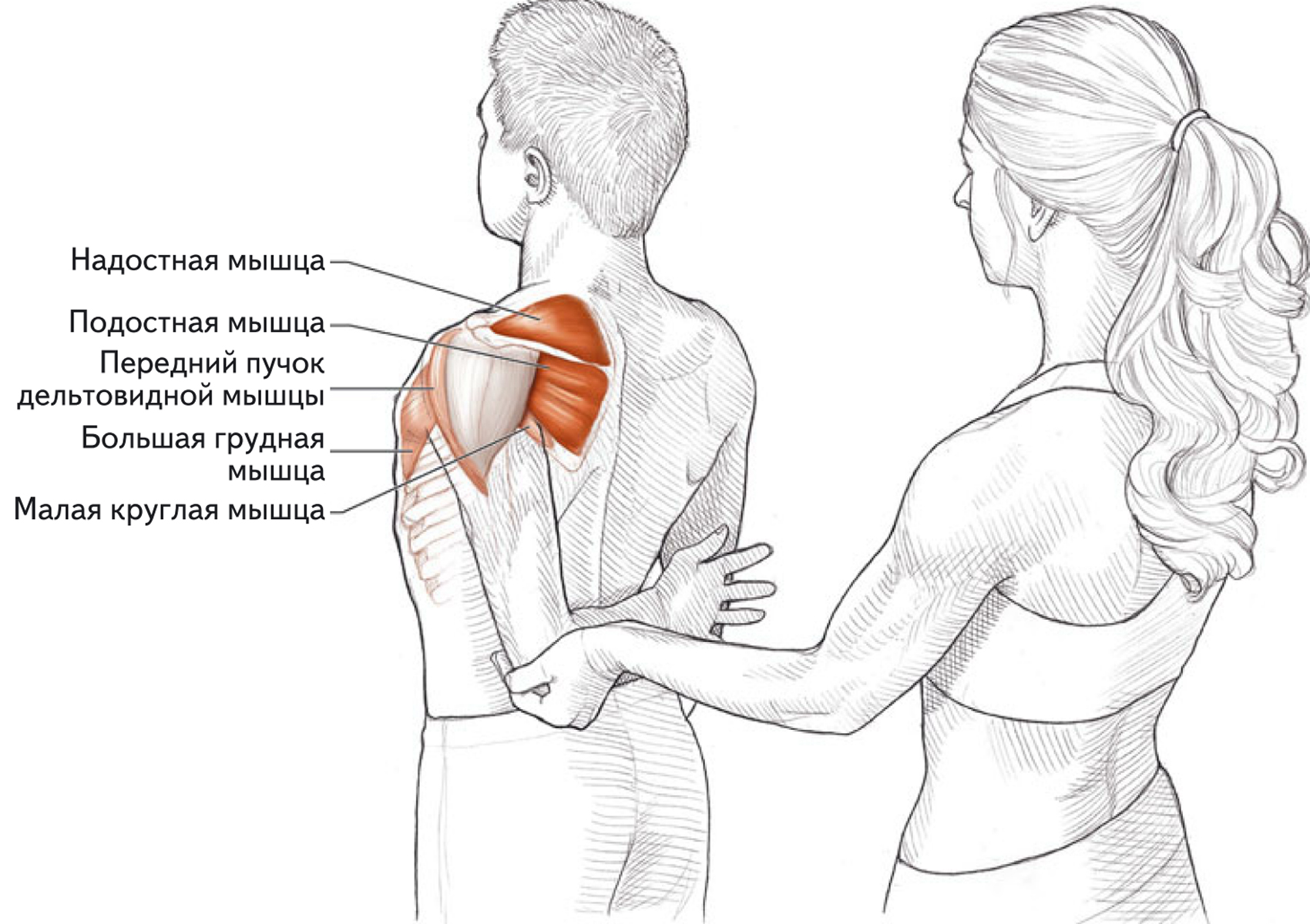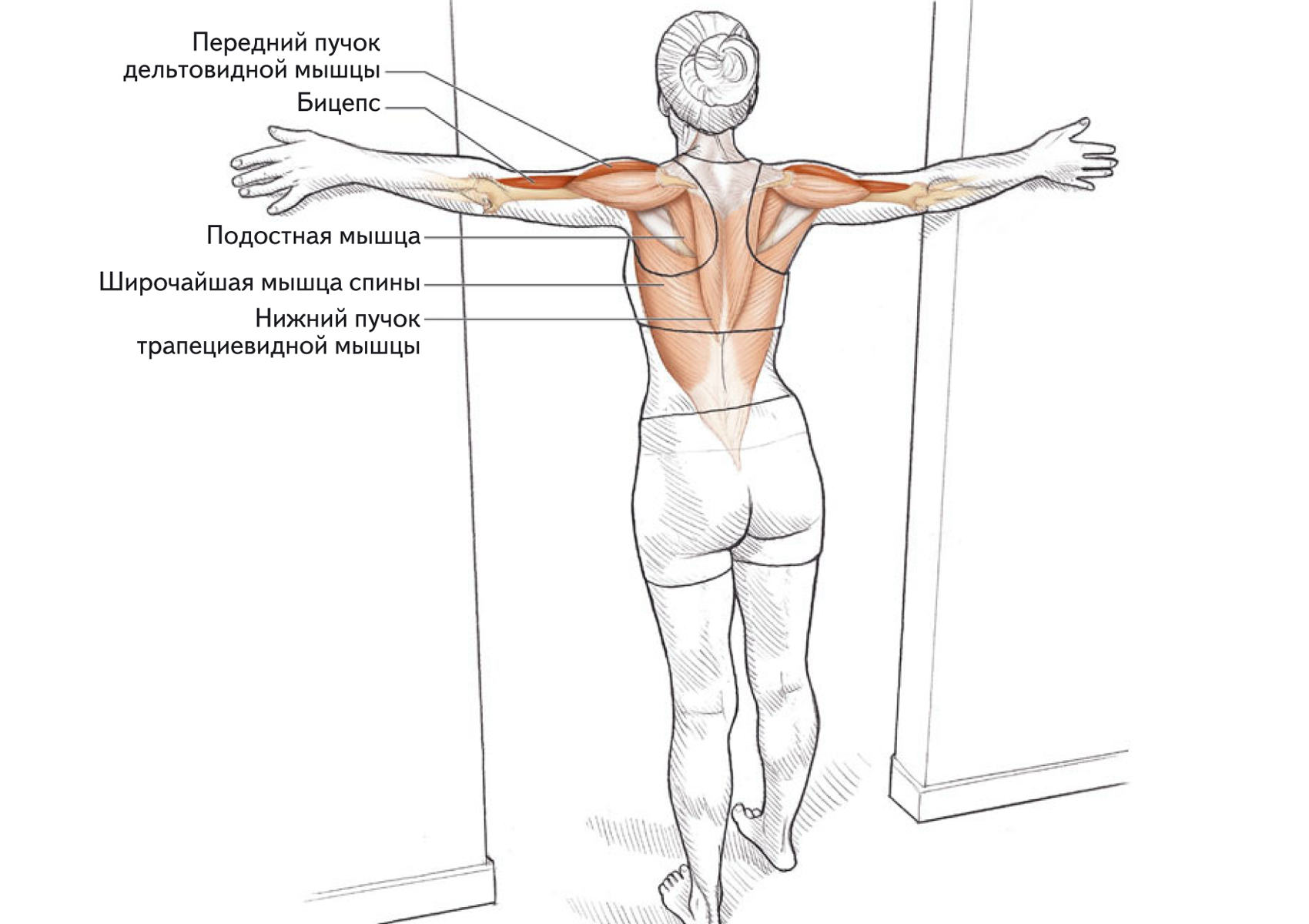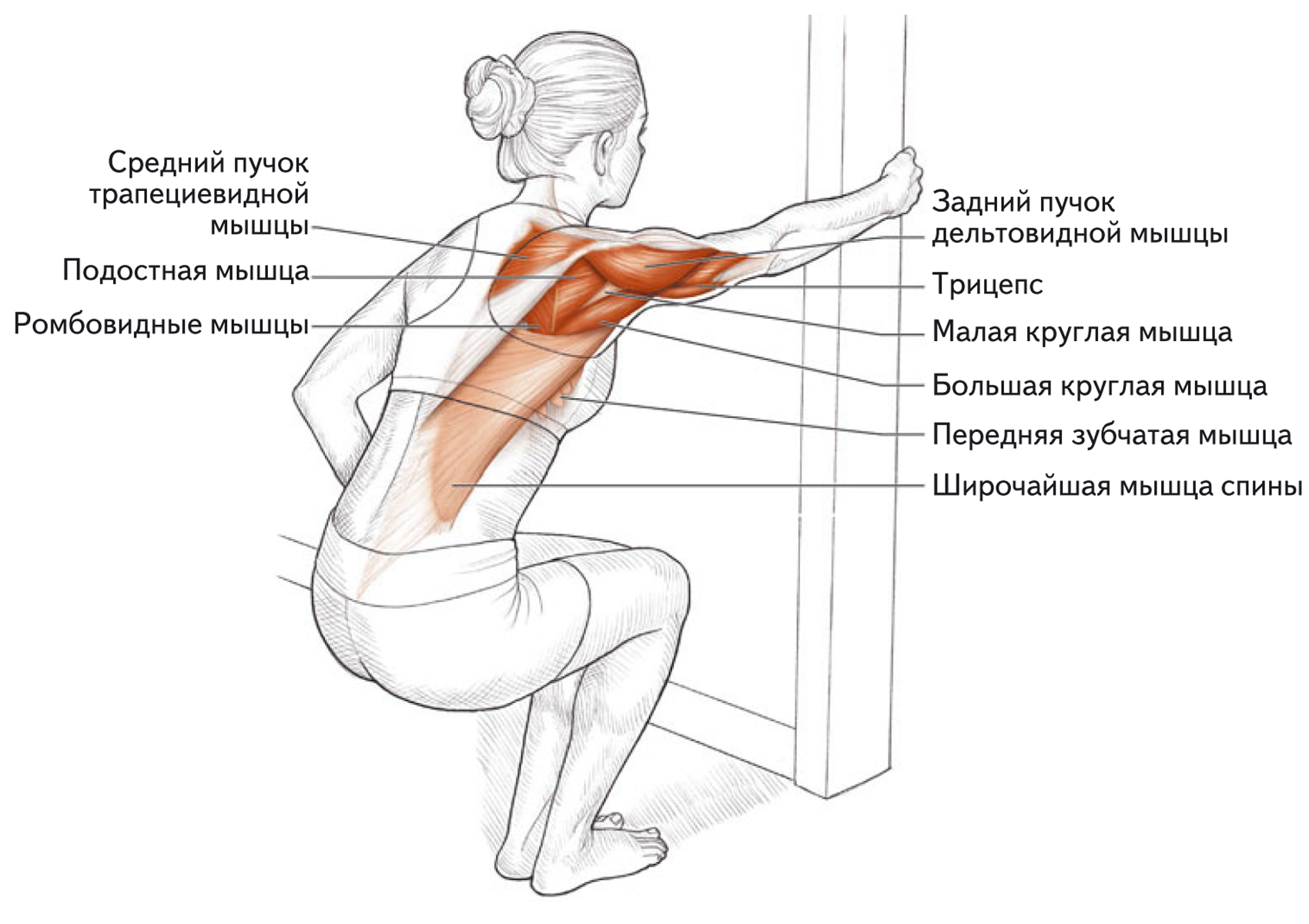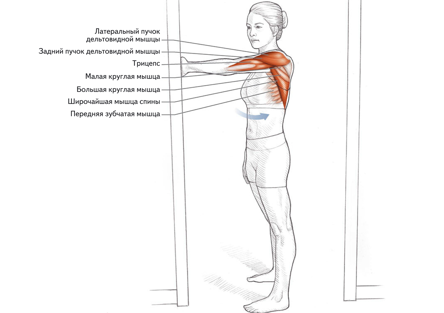 Растяжка мышц, отводящих руку в плечевом суставе.
