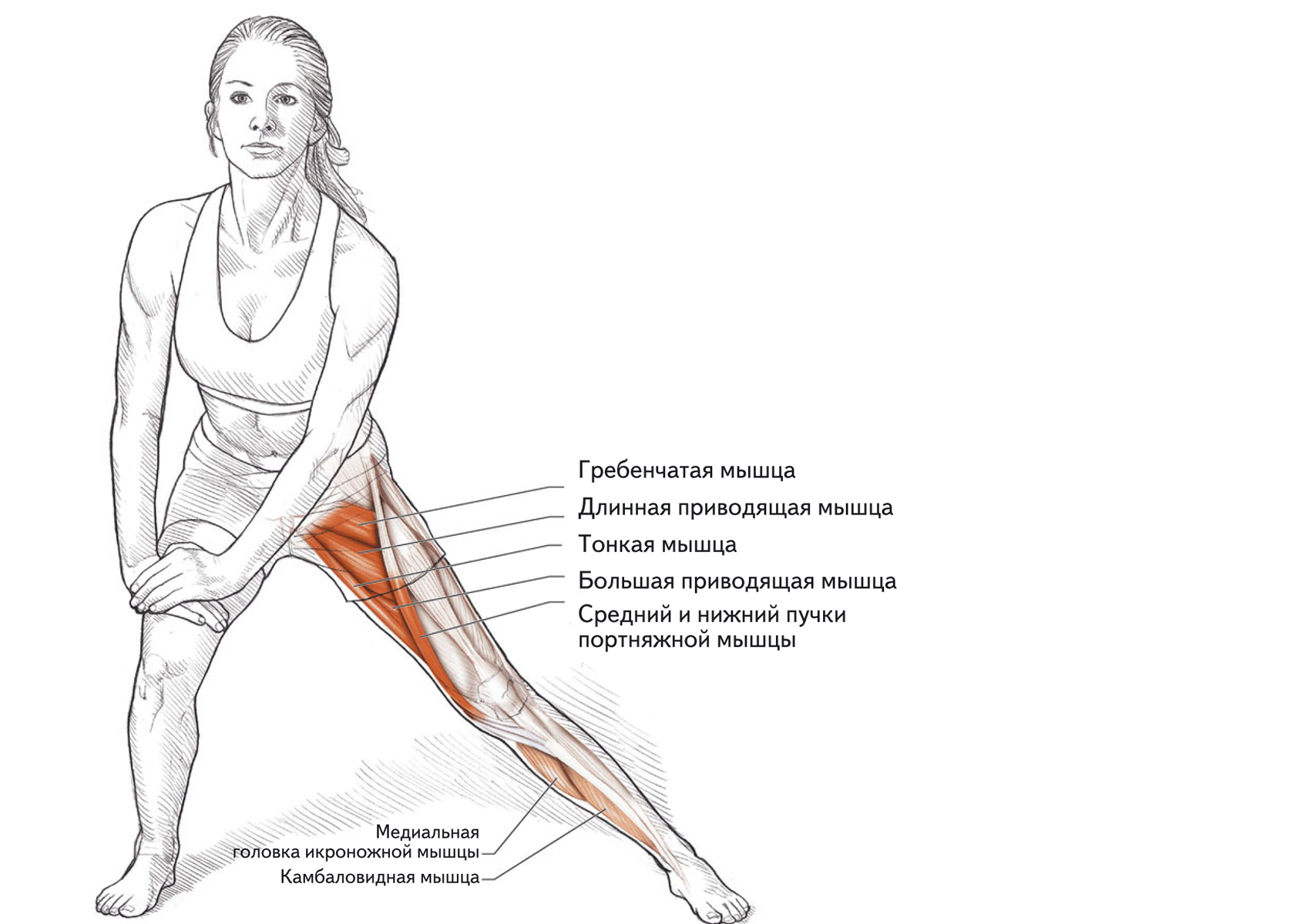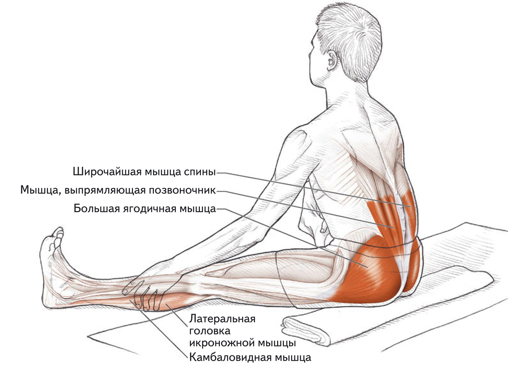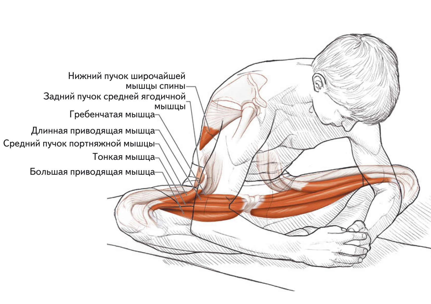Растяжка мышц, разгибающих и приводящих ногу в тазобедренном суставе, в положении сидя.