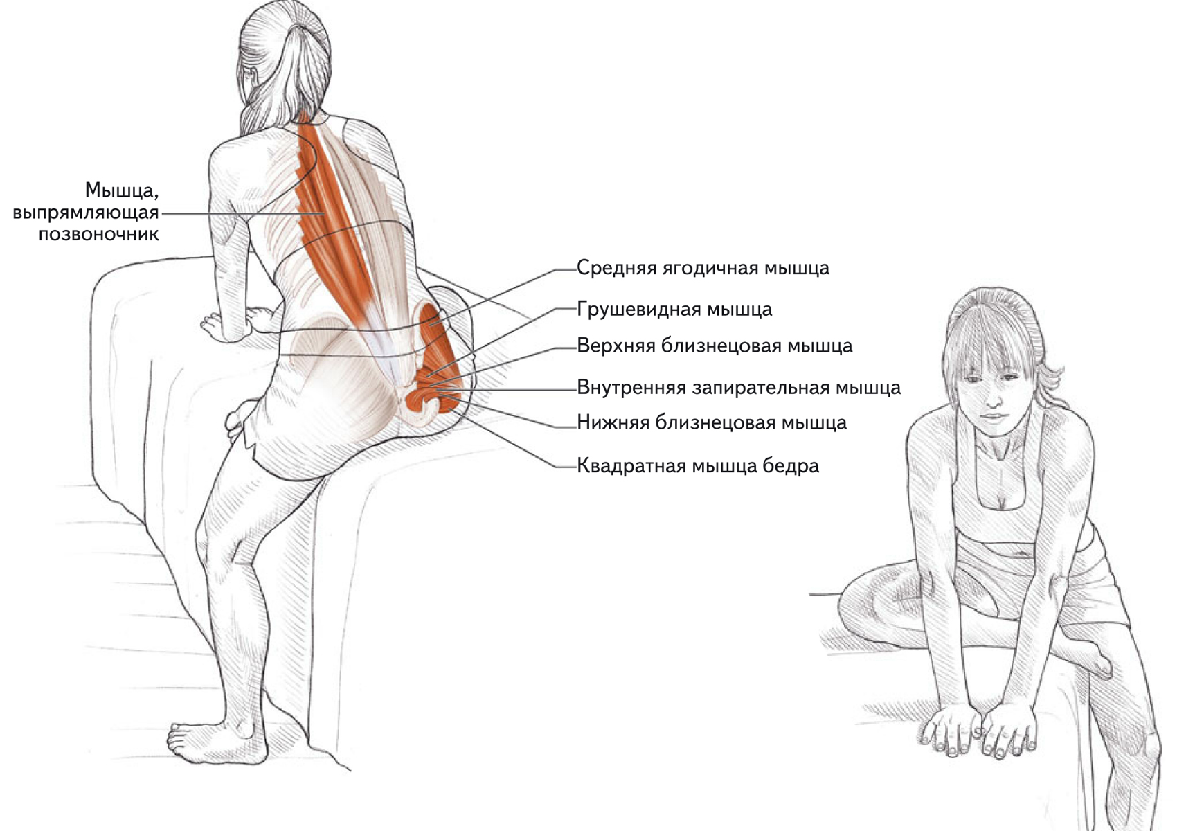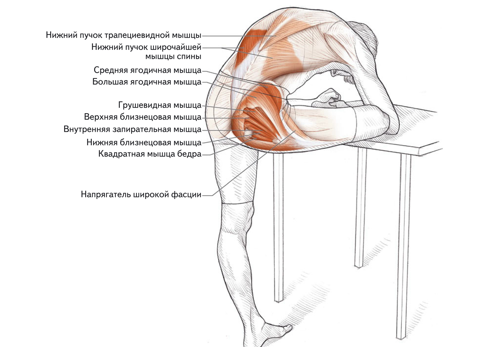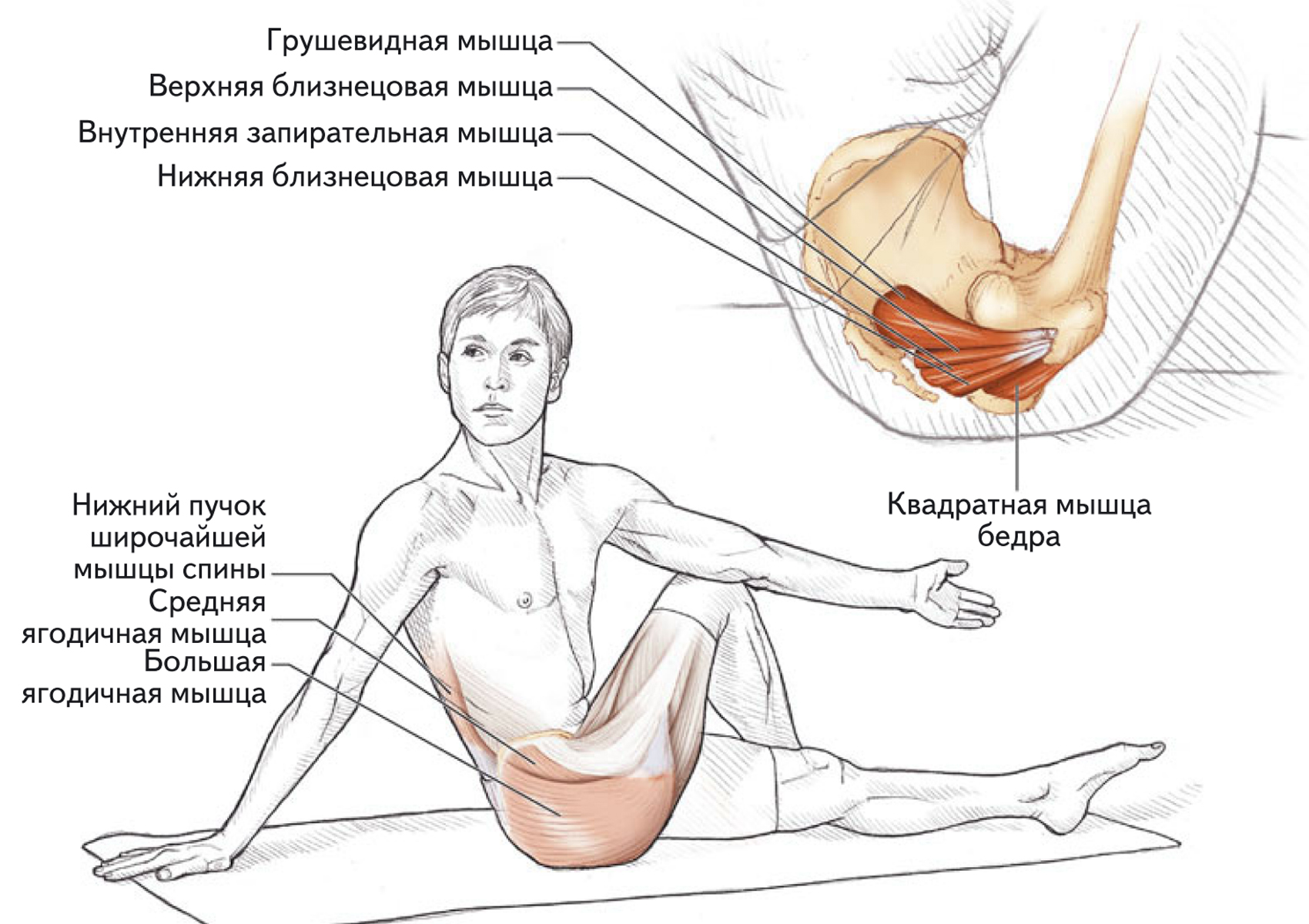 Растяжка мышц, разгибающих и приводящих ногу в тазобедренном суставе, в положении сидя.