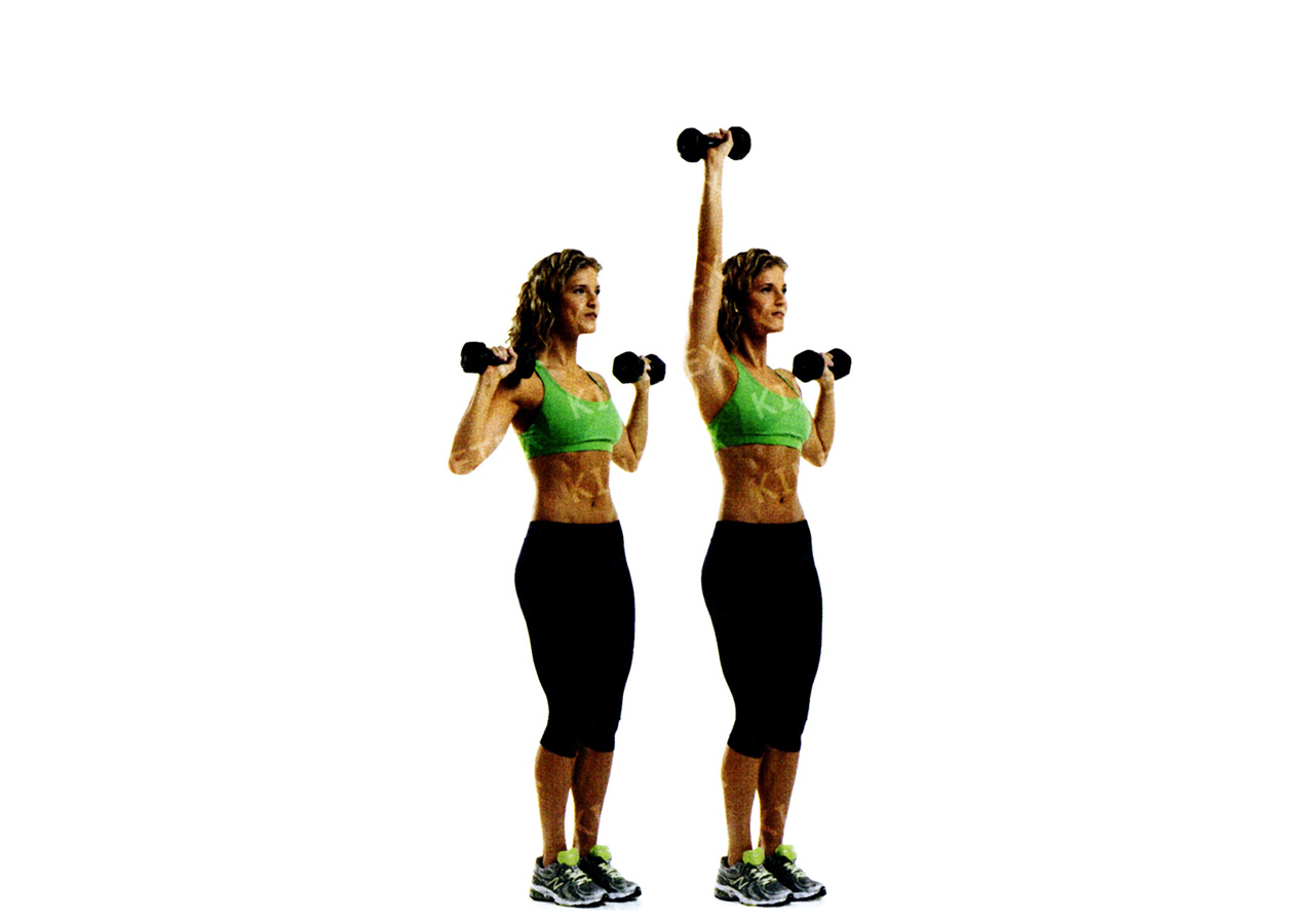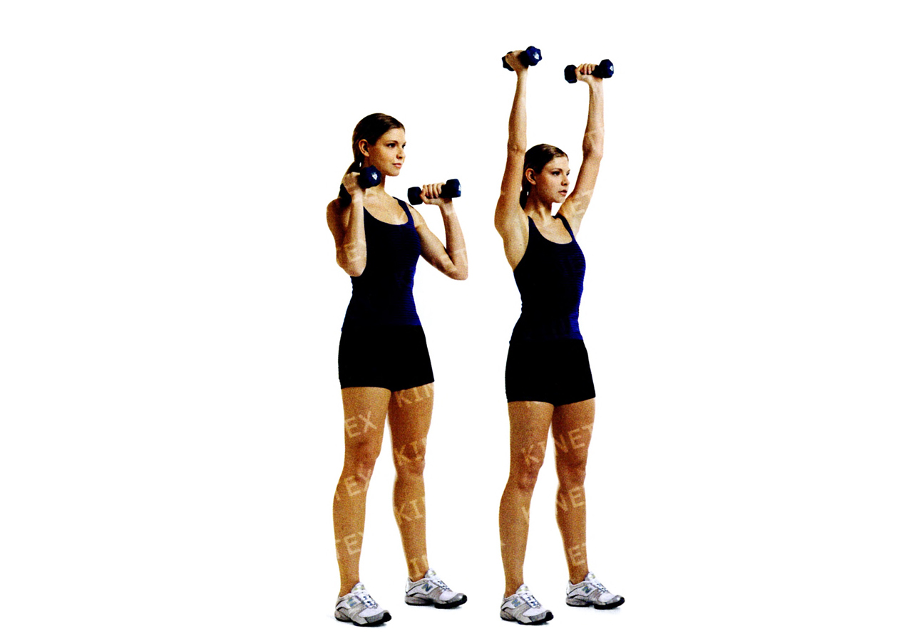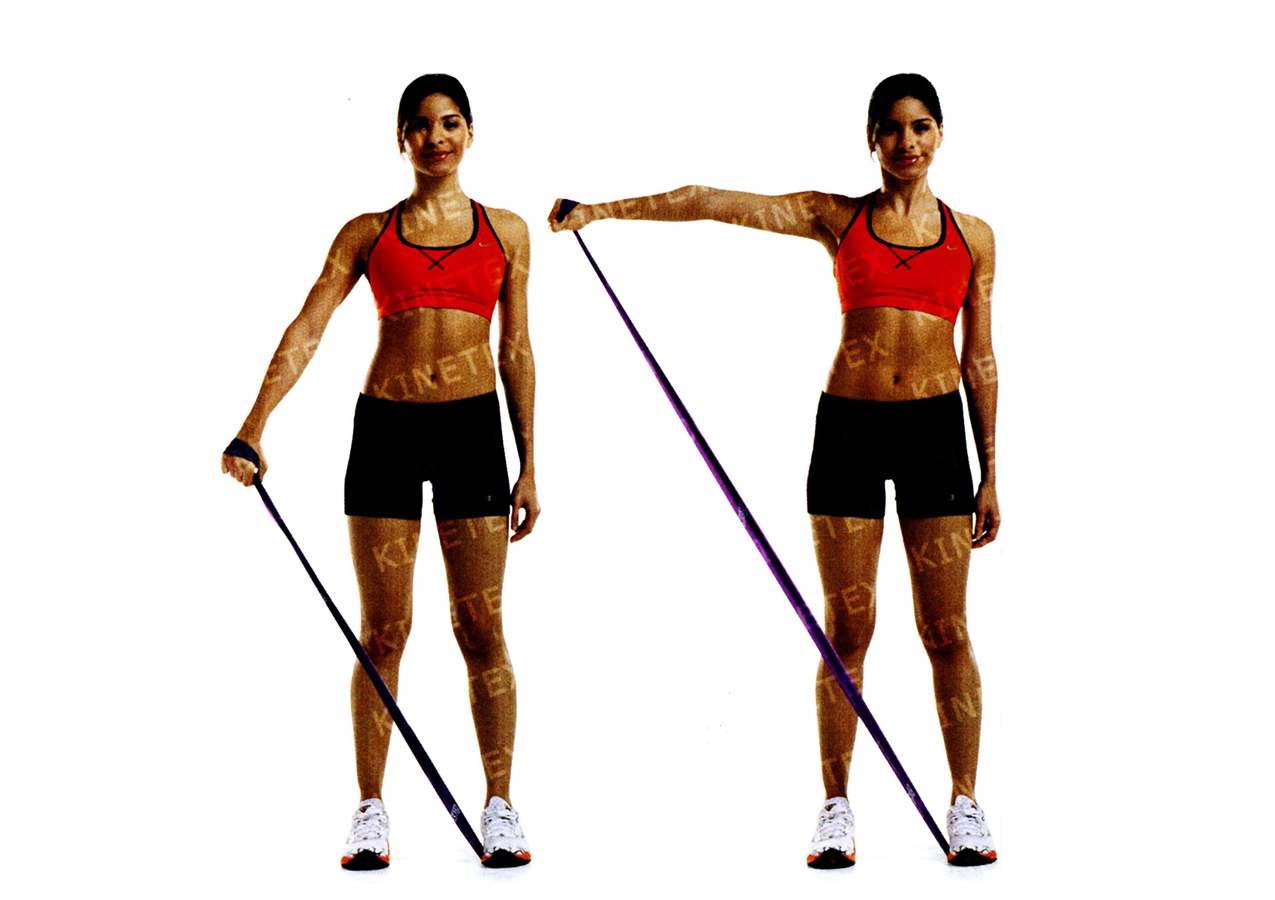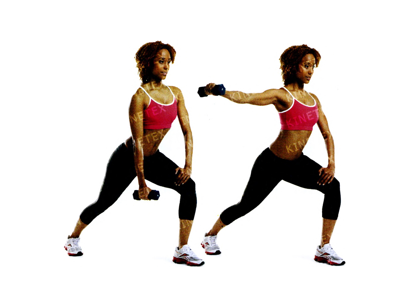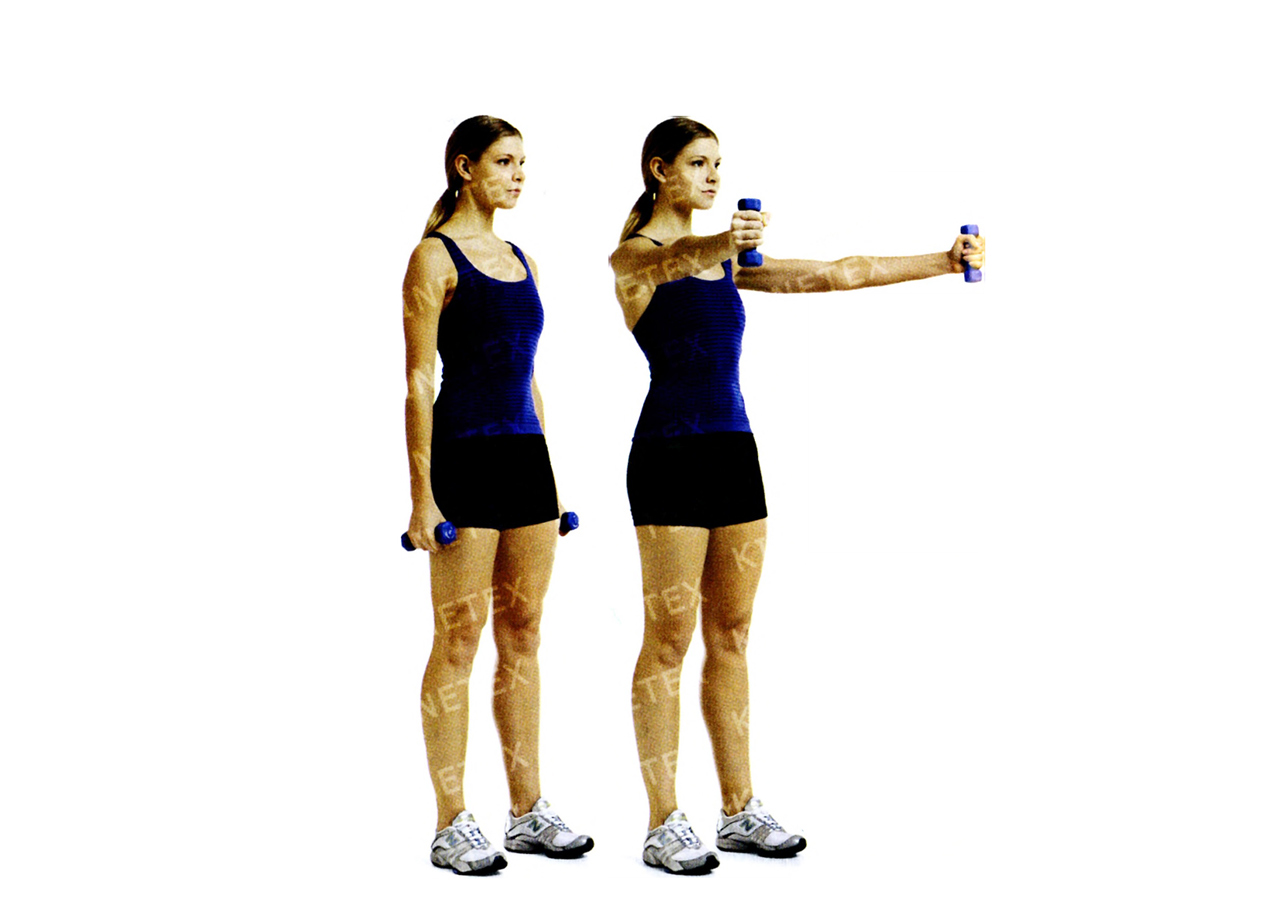 • Поднимите гантель в сторону до уровня плеч, затем опустите. Вернитесь в исходное положение. Это одно повторение. Сделав необходимое количество повторений, поменяйте руки и ноги и снова выполните упражнение.