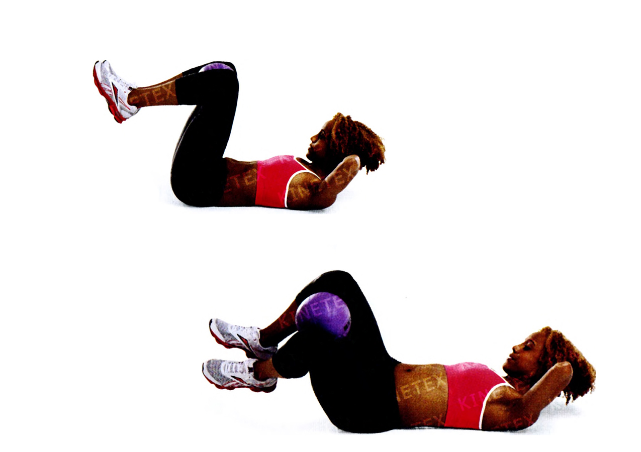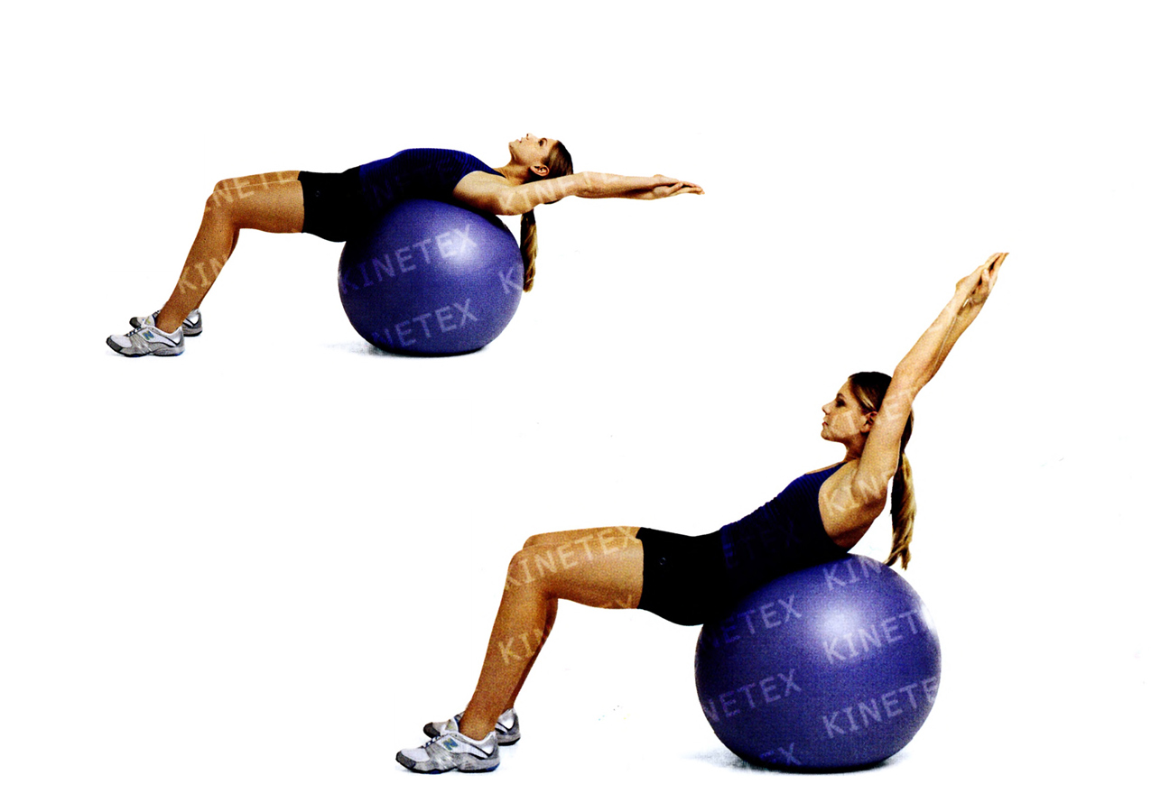 • Лягте спиной на гимнастический мяч, ступни прижаты к полу. Вытяните руки за головой так, чтобы они продолжали линию туловища, и положите ладонь на ладонь.