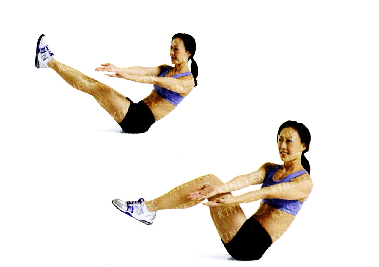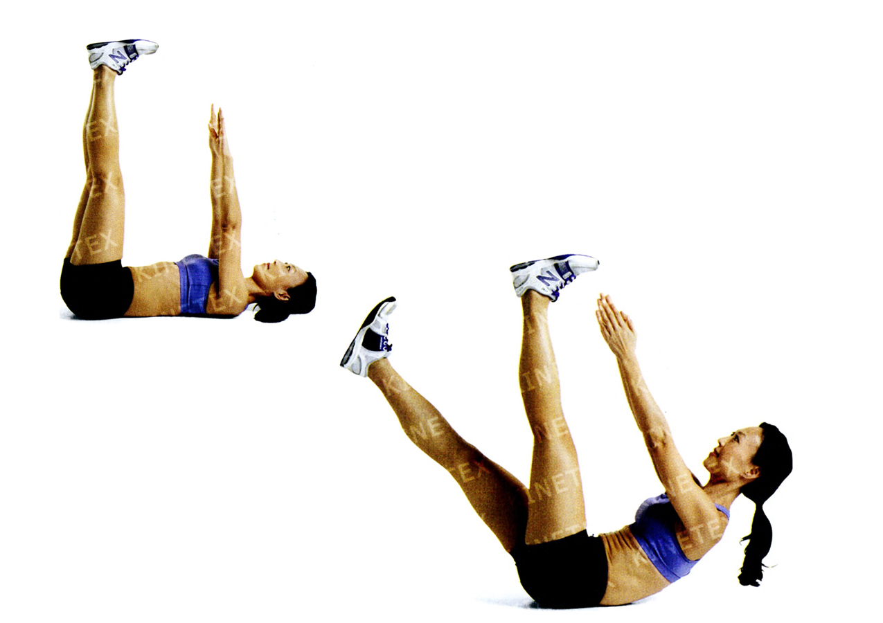 • Вытяните руки вертикально вверх перед грудью. Напрягите брюшной пресс и опустите ноги так, чтобы они образовали угол 45 градусов с полом.
