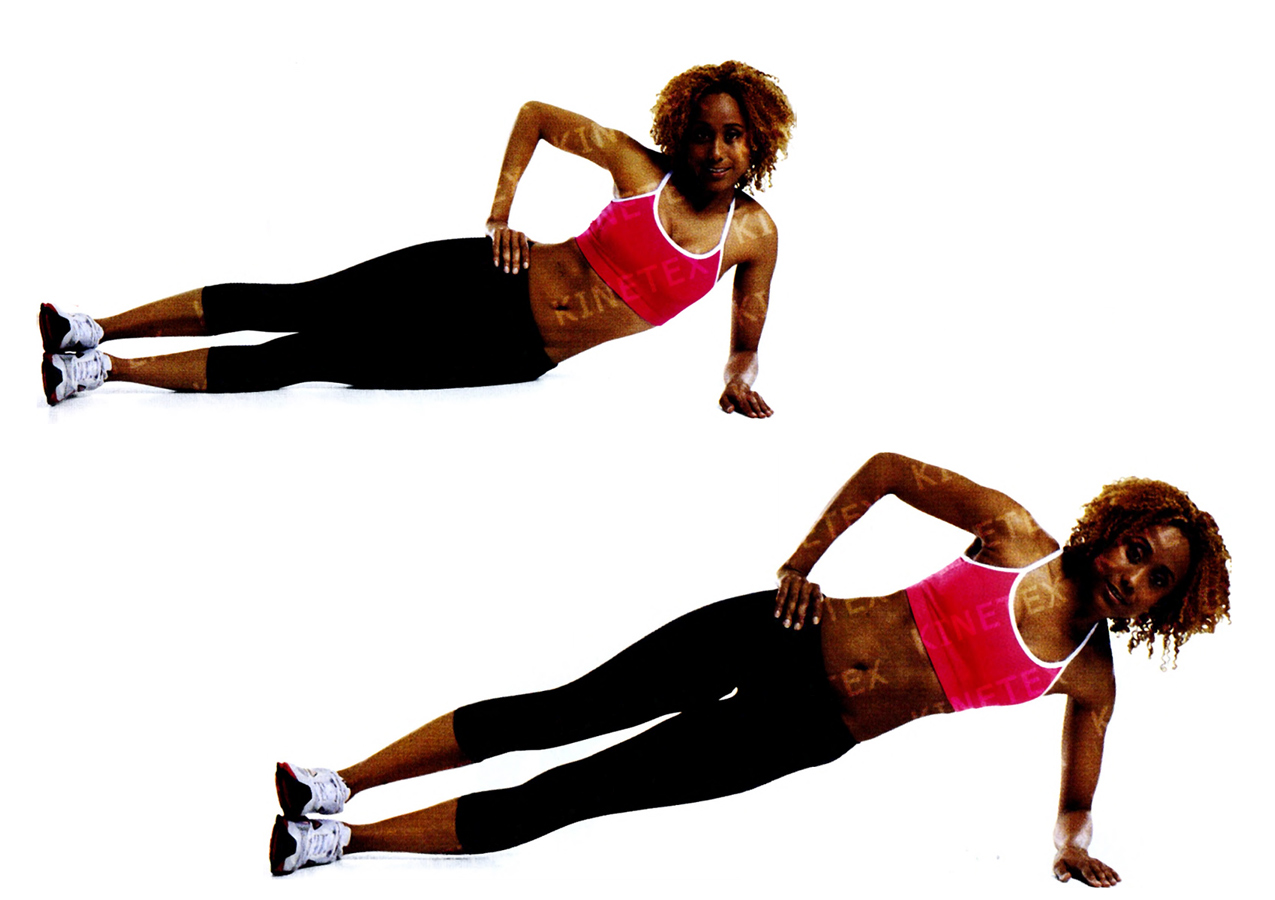 • Поднимите таз так, чтобы тело образовало одну прямую линию. Правую руку положите на пояс. Напрягите брюшной пресс и удерживайте его в таком состоянии.