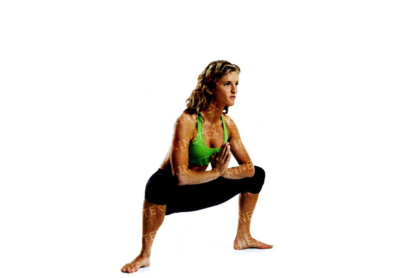 • Разводите ноги на расстояние 1,2 метра и поверните левую стопу на 90 градусов влево. Держа спину прямо, вытяните руки в стороны; ладони обращены вниз.