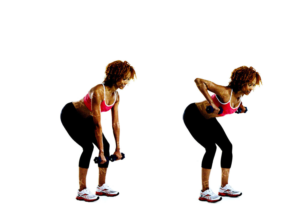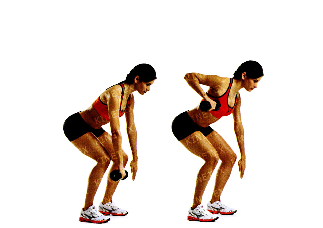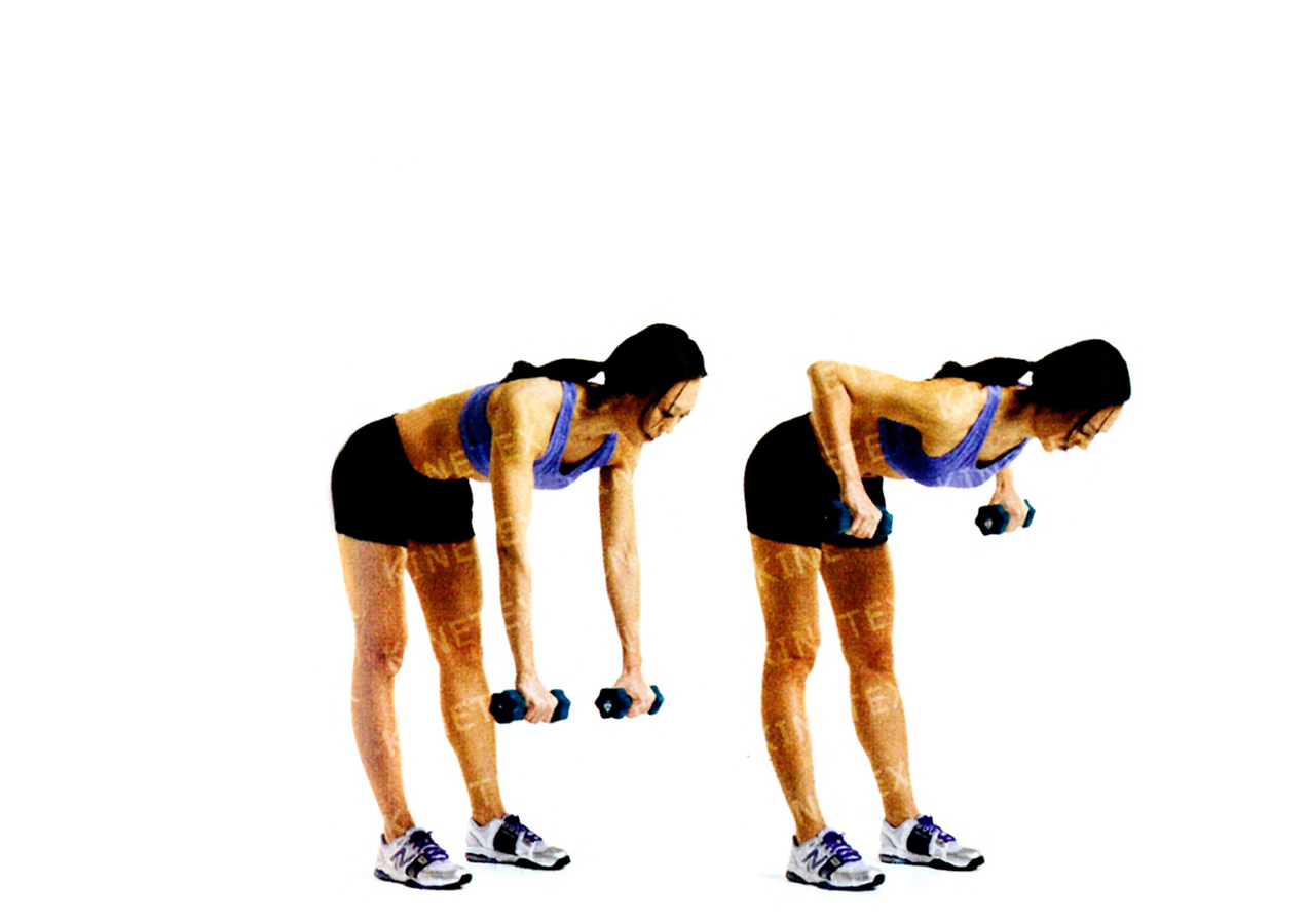• Сведите лопатки и подтяните гантели к бокам корпуса, а затем опустите их в исходное положение.