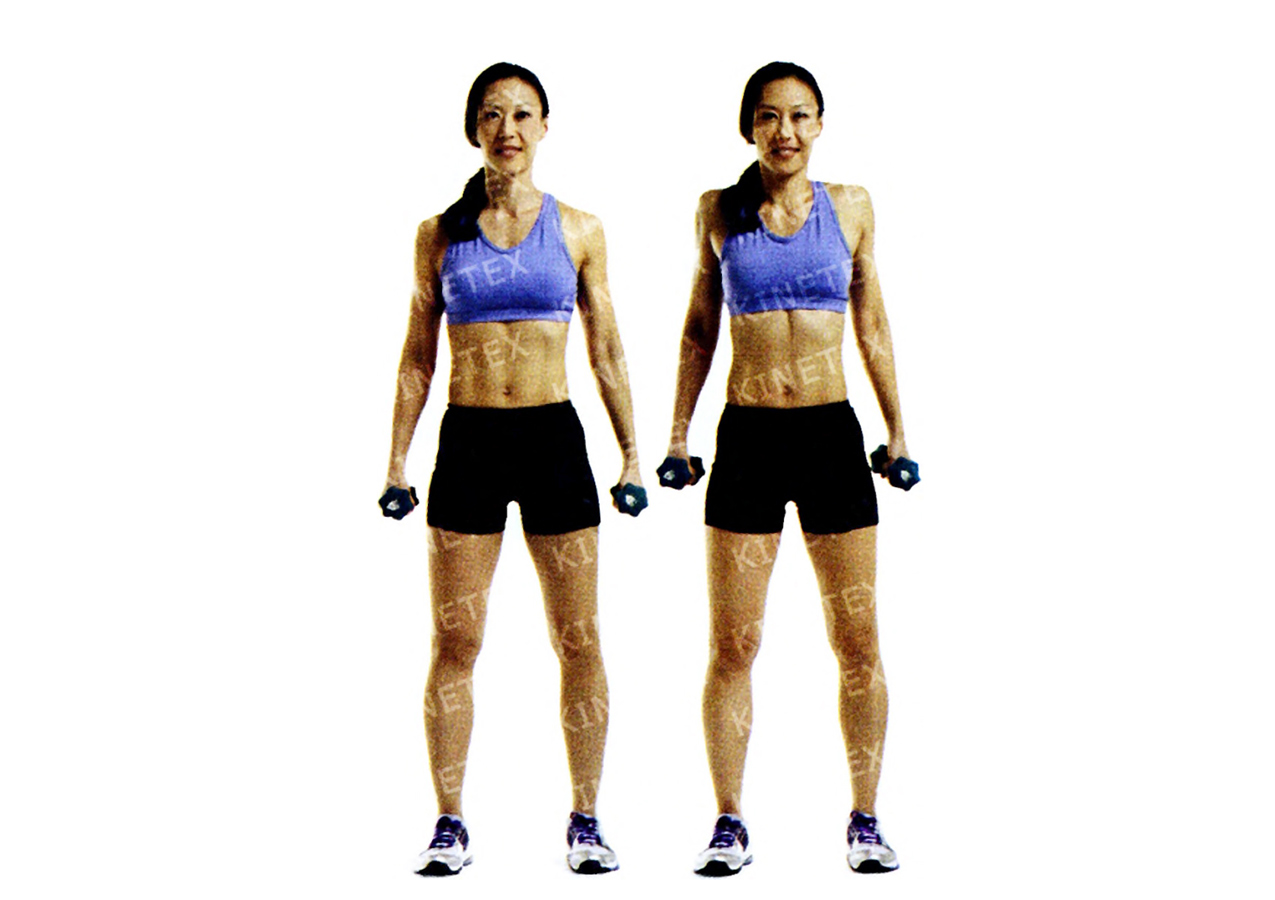 • Возьмите гантели весом 1,5-3,5 кг. Встаньте прямо, руки опущены по бокам, ладони обращены назад.