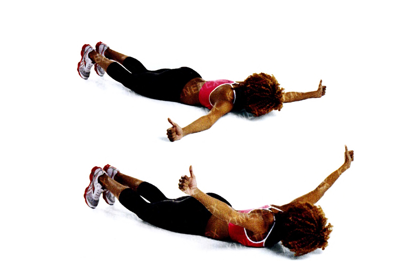 • Лягте на живот и разведите руки в стороны так, чтобы ваше тело приняло Т-образную форму. Сожмите руки в пустые кулаки, большие пальцы обращены вверх.