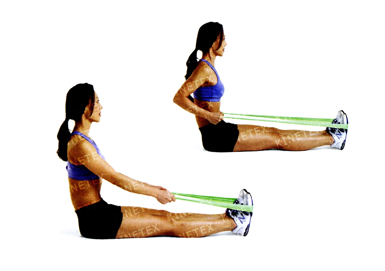 • Сядьте на пол, выпрямив ноги перед собой и обхватив стопы резиновым ленточным эспандером. Концы эспандера держите выпрямленными руками. Спина ровная.