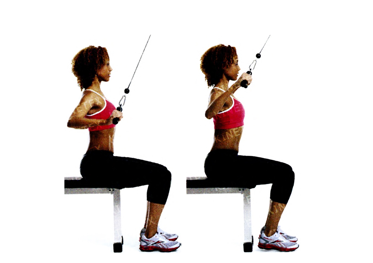 • Сядьте лицом к тренажеру и возьмитесь за рукоять широким верхним хватом.