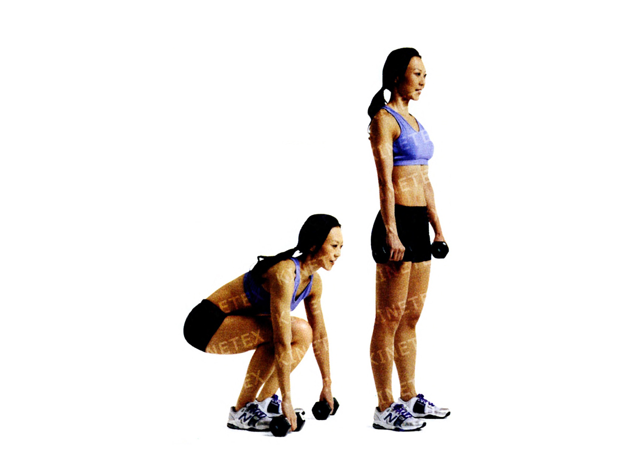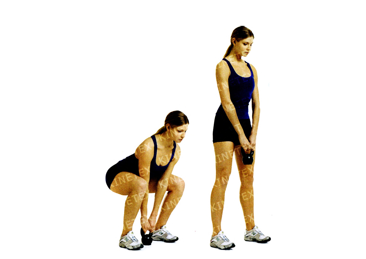 • Напрягите брюшной пресс, мышцы ягодиц и медленно вставайте, выпрямляя ноги с опорой на пятки и держа гирю в прямых руках. Это одно повторение.